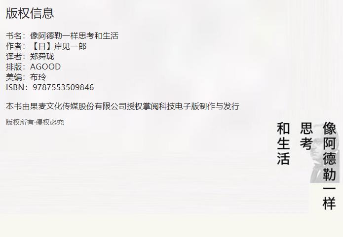 《像阿德勒一样思考和生活》是日本哲学作家岸见一郎撰写的书籍,相对于岸见一郎其他的作品更全面解说阿德勒心理学思想。其中描述了阿德勒的人际关系论、生活方式论、教育论、"个体心理学"的形成和发展等等这些是大部分人都会遇到的困惑,并梳理了阿德勒心理学中面对人生这些困难的科学方法,让人生的难,变得简单。